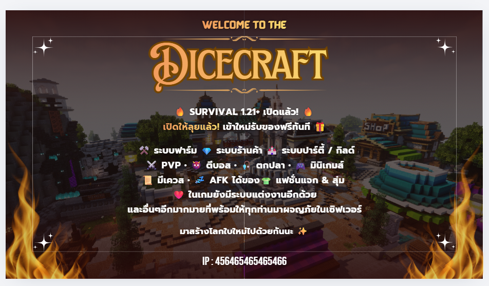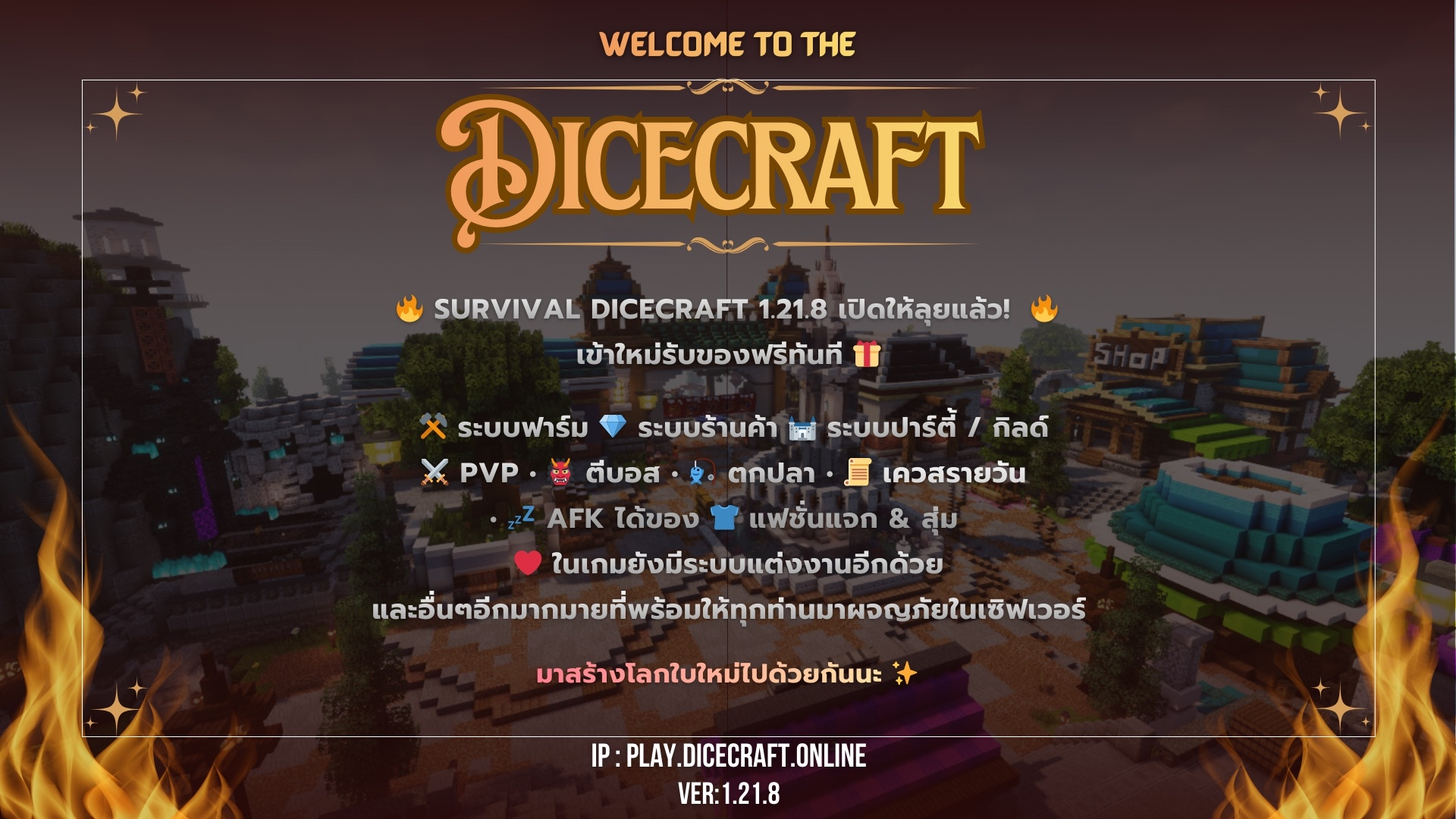 Dicecraft ไม่ได้เป็นแค่เซิฟเวอร์ แต่คือโลกที่คุณจะได้เริ่มต้นและเติบโตไปพร้อมกัน ❤️