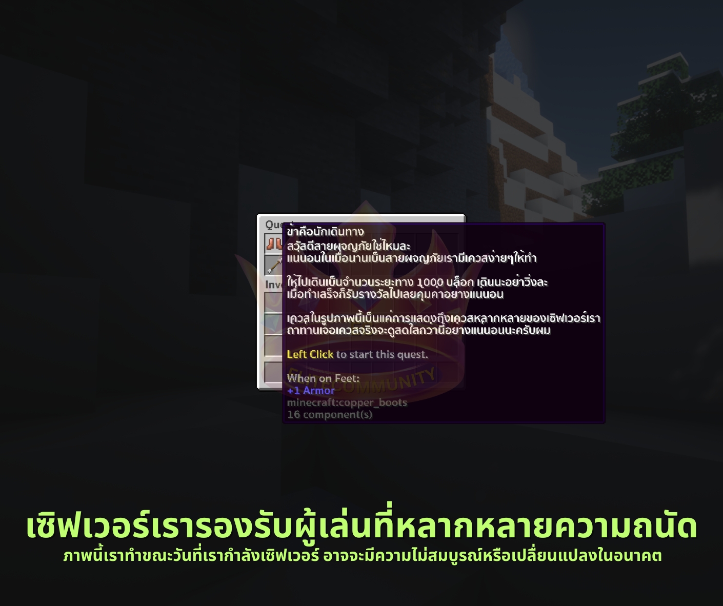 ณ วันที่เราโปรโมทเซิฟเวอร์ยังอยู่ในช่วงกำลังพัฒนา สิ่งต่างๆที่จะเขียนอาจจะมีการเปลื่ยนเพิ่มเติมในอนาคต
